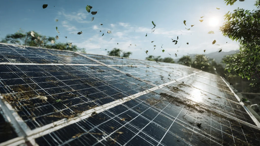 A poeira forma uma camada que bloqueia a luz solar, reduzindo a captação. Em regiões secas, isso acumula rapidamente, causando sombras parciais nas células.